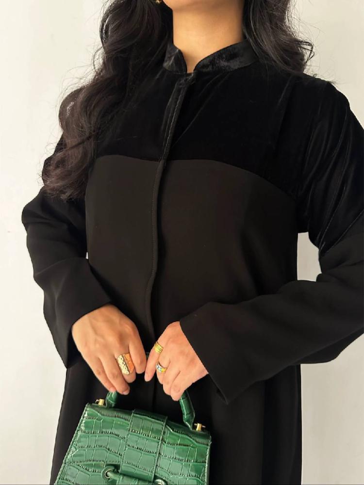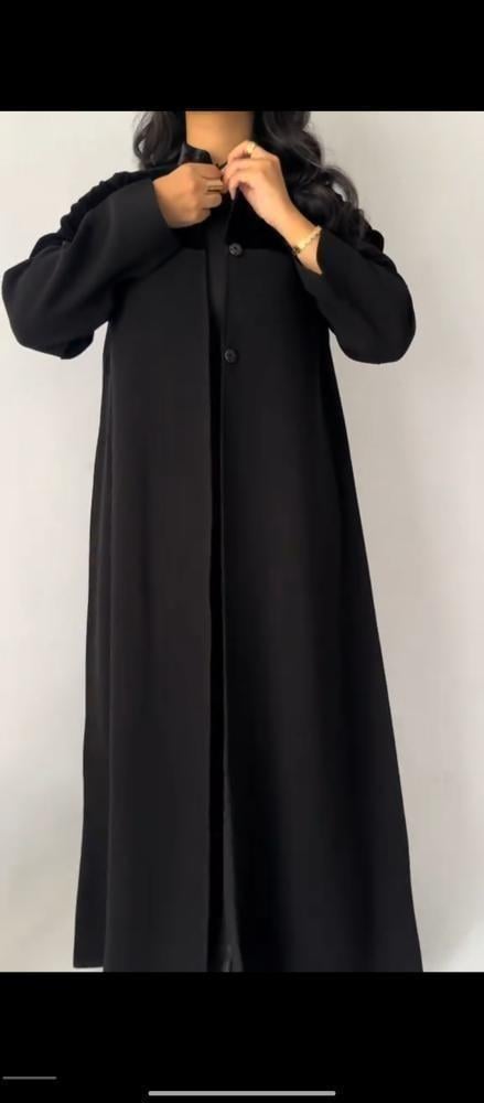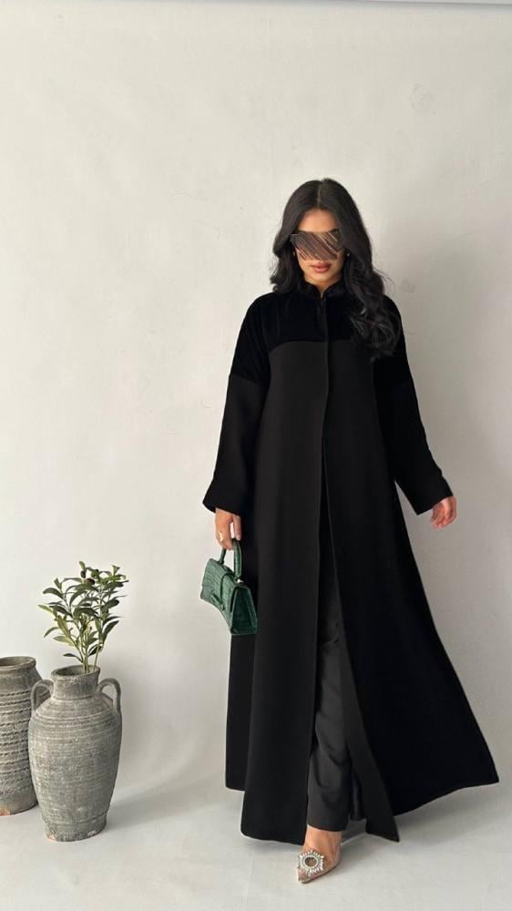 وصف الموديل: عبايه قماش الكتان الملكي بأكمام حرير توفرت باللون الاسود